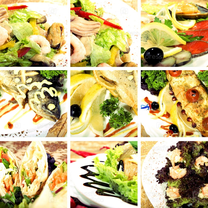 Коллаж из блюд с морепродуктами и овощами