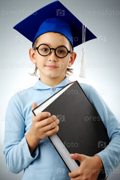 Маленький мальчик в шляпе бакалавра с книгой в руках