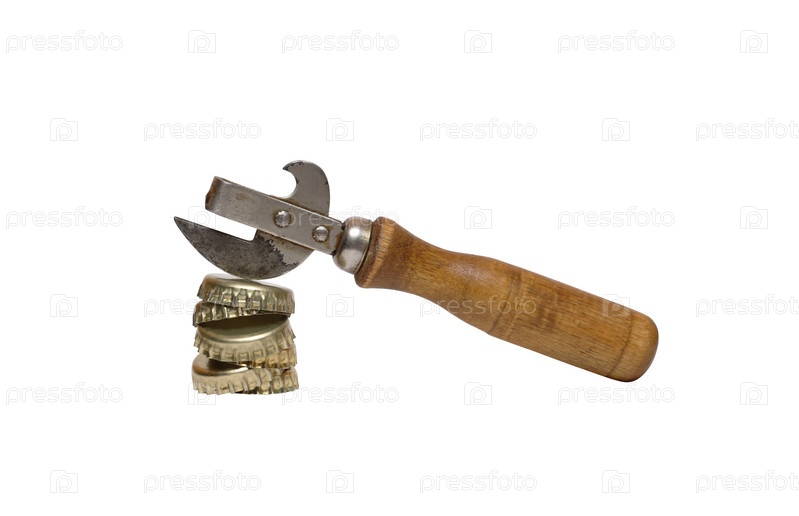 Стопка бутылочных крышек и старый консервный нож