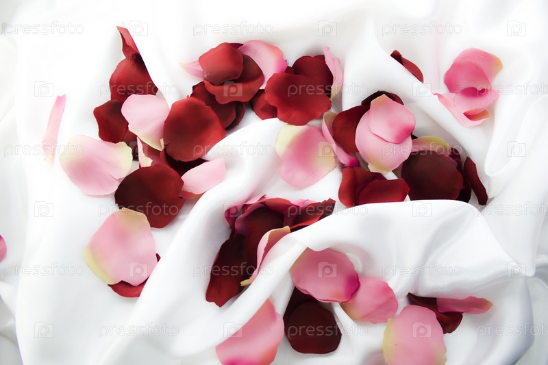Листья роз разбросаны по белому шелку