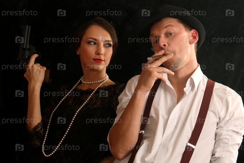 Портрет мужчины в шляпе с сигарой и красивая женщина с пистолетом в руке