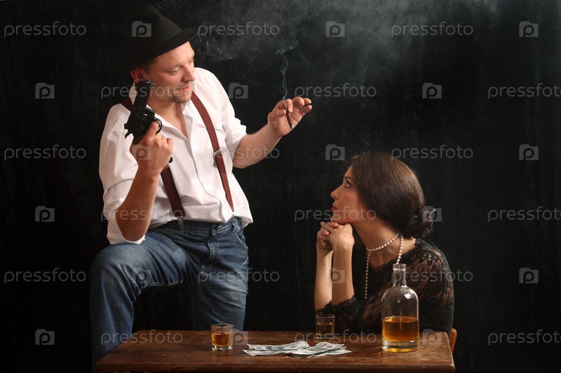 Мужчина-гангстер разговаривает с красивой женщиной в баре