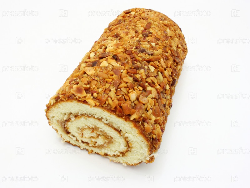 Сладкий рулет с орехами на белом фоне