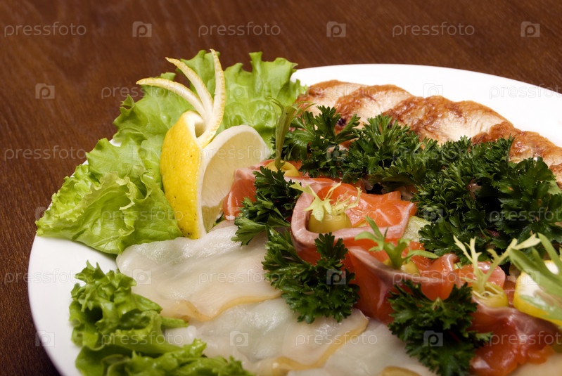 Закуска из мяса и рыбы, подается с салатом на круглой тарелке
