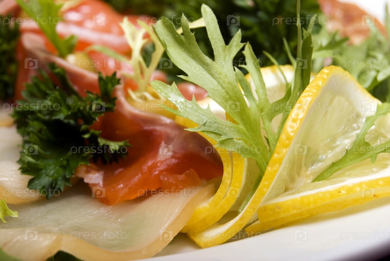 Закуска из мяса и рыбы, подается с салатом на круглой тарелке