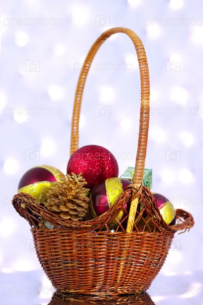 Елочные шары и шишки в плетеной корзине
