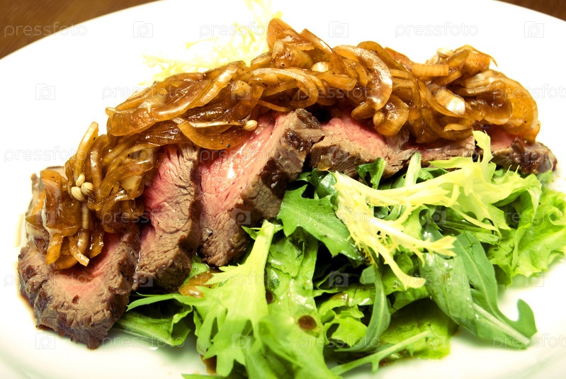 Мясо с салатом и луком на белом блюде
