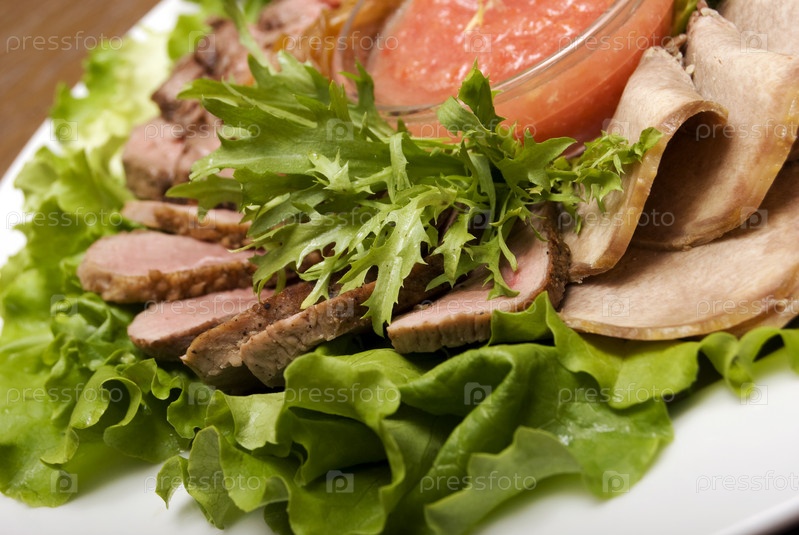 На столе мясо с салатом и соусом на белом блюде
