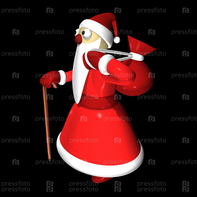 Санта Клаус или Дед Мороз с пакетом подарков. 3D. Изоляция на черном фоне
