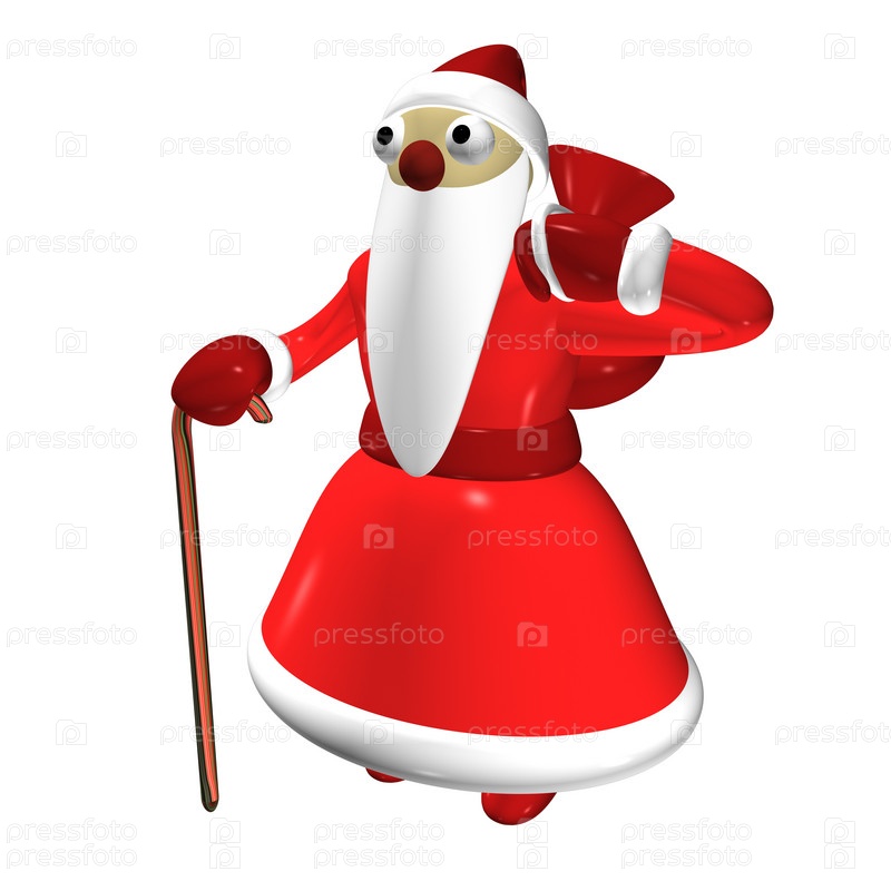 Санта Клаус или Дед Мороз с мешком и палкой, изолированный на белом фоне. 3d