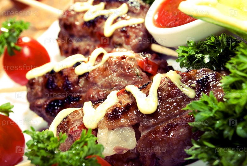 Жареное мясо с помидорами, соусом и зеленью