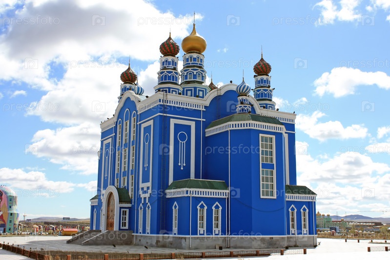 Красивый синий монастырь с разноцветными куполами на фоне неба