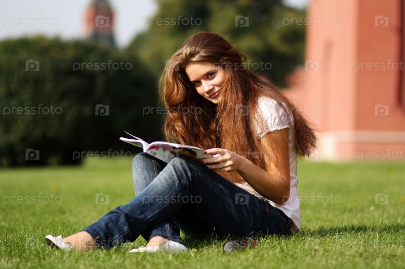 Девушка с журналом сидит на траве