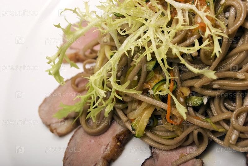 Спагетти с мясом и рукколой на тарелке