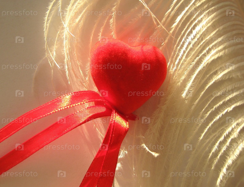 Белые перо и красное сердечко на светлом фоне