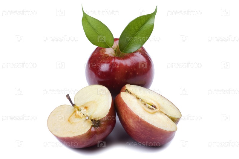 Две половинки красного яблока рядом с целым на белом фоне