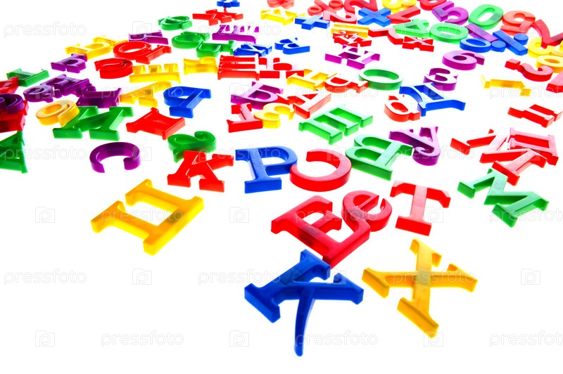 Игрушечные пластиковые буквы и цифры на белом фоне