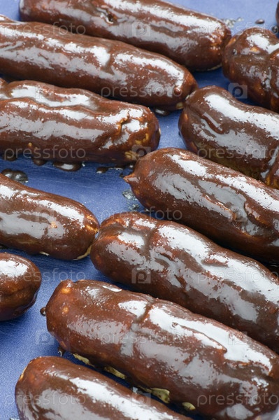 Шоколадные эклеры крупным планом на синем фоне