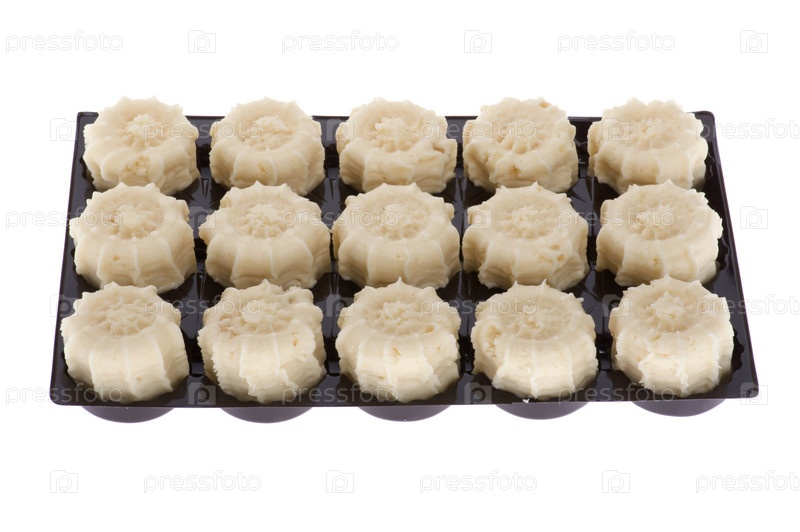 Поднос с белыми сладкими конфетами на белом фоне