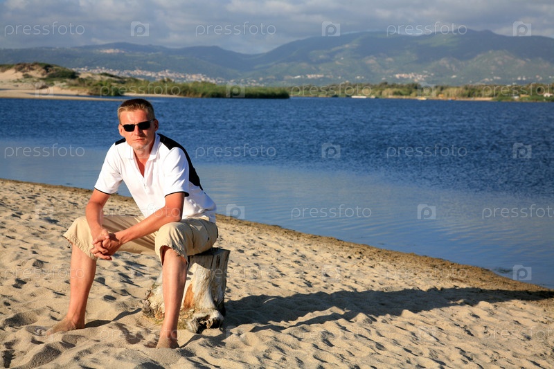 Молодой мужчина сидит на пне на берегу водоема