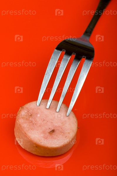 Горячая сарделька на вилке крупным планом