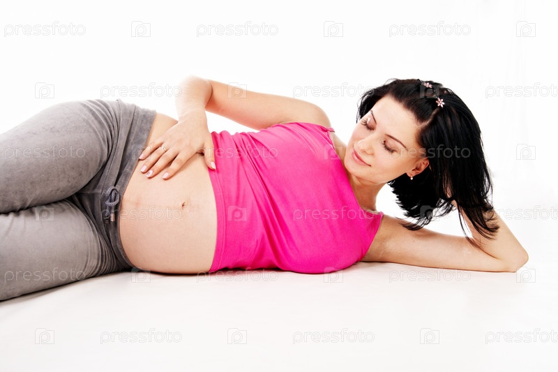 Беременная женщина лежит на белом фоне
