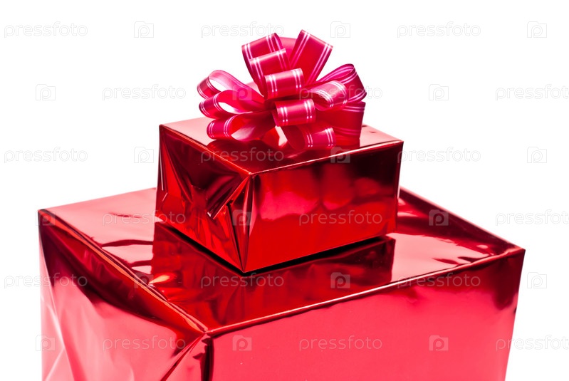 Подарки в красной упаковке с бантом на белом фоне
