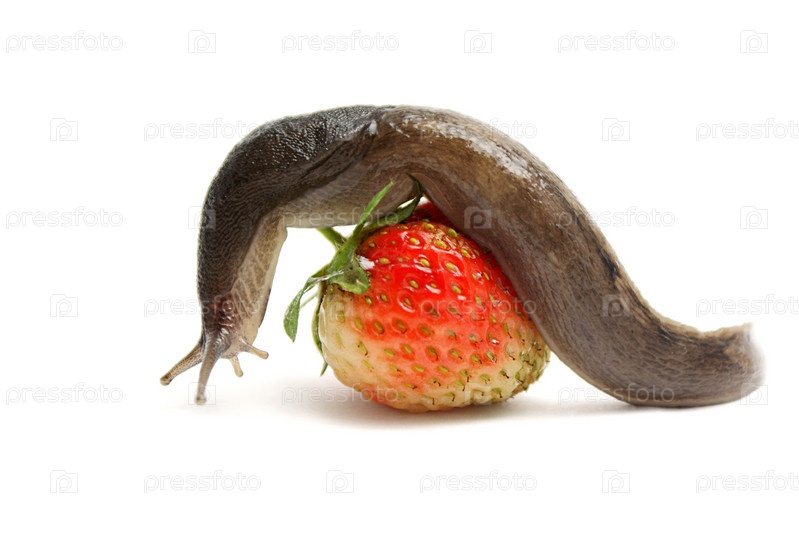 Слизень на клубнике крупным планом