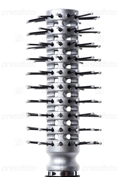 Круглая расческа для укладки волос на белом фоне