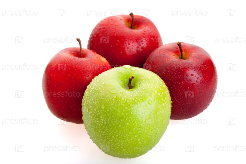 Три красных и одно зеленое яблоко на белом фоне