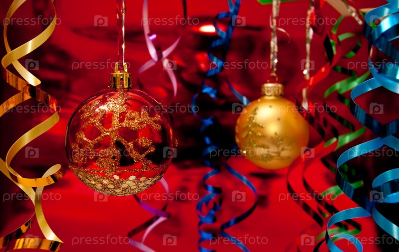 Елочные украшения с цветными лентами на красном фоне