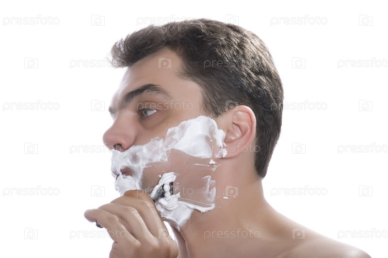 Мужчина бреется на белом фоне