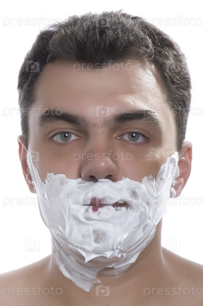 Мужчина в пене для бритья на белом фоне