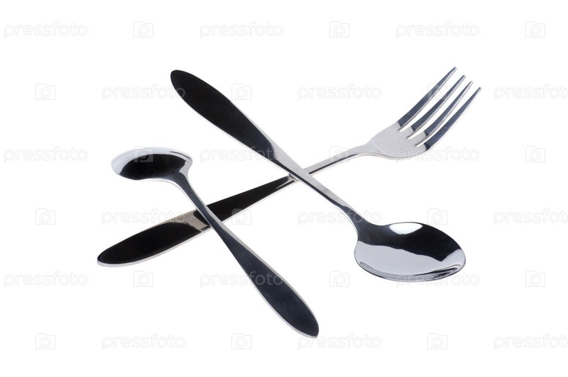 Две ложки и вилка на белом фоне