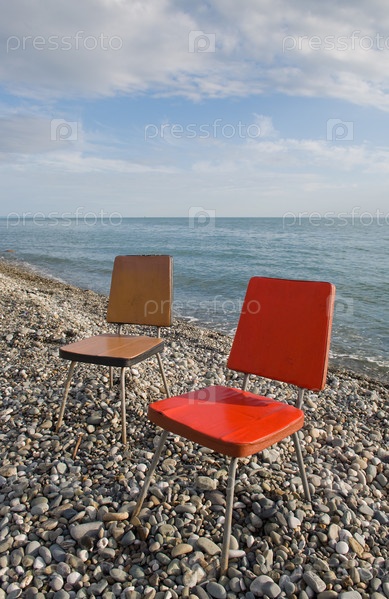 Два старых разноцветных стула на берегу моря