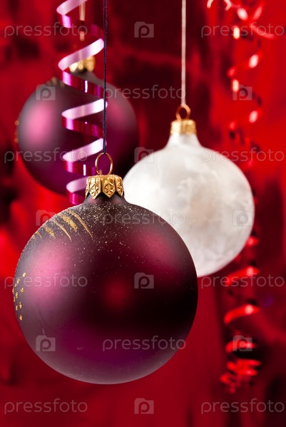 Красивые елочные украшения на красном фоне