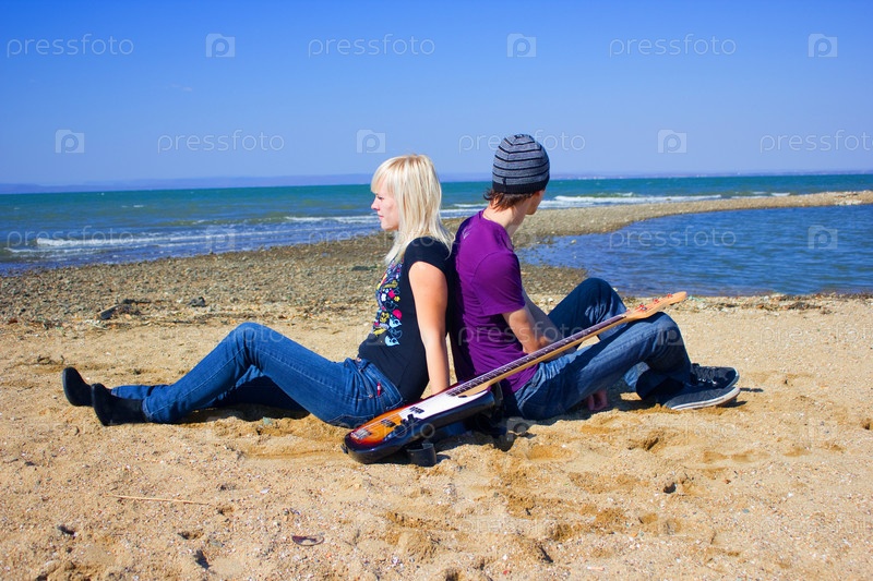 Молодые парень и девушка, сидящие на берегу спинами друг к другу