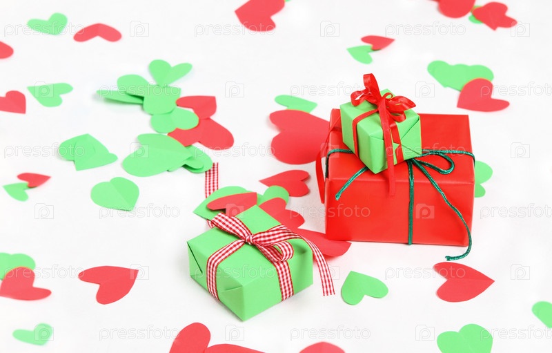 Коробки с подарками на белом фоне, засыпанном сердечками из бумаги