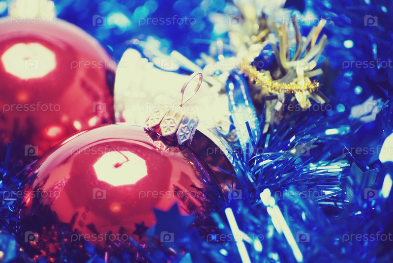 Красные елочные шары и серебряный колокольчик на синей мишуре