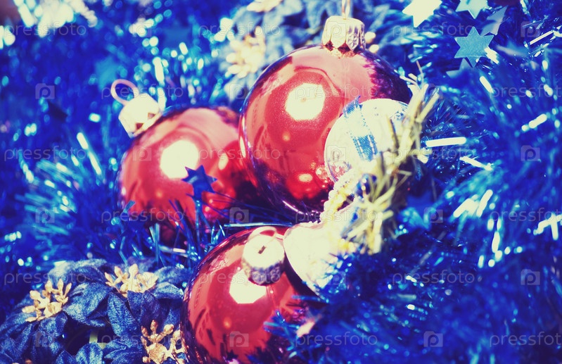 Красные елочные шары и серебряный колокольчик на синей мишуре