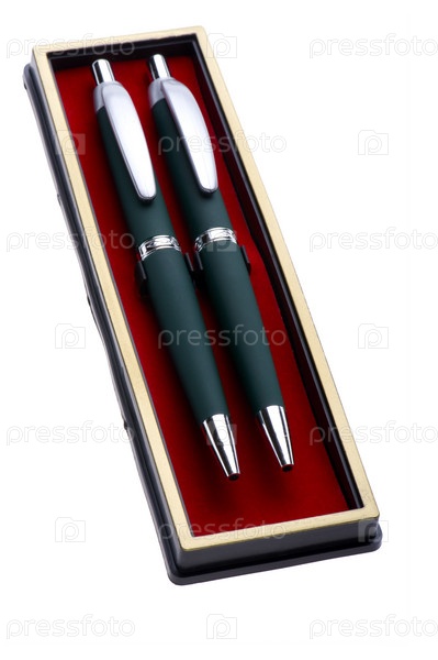 Две ручки в футляре на белом фоне