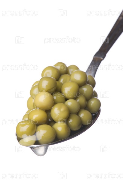 Зеленый горошек в ложке на белом фоне