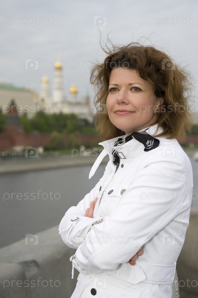Молодая женщина на мосту на фоне Московского Кремля