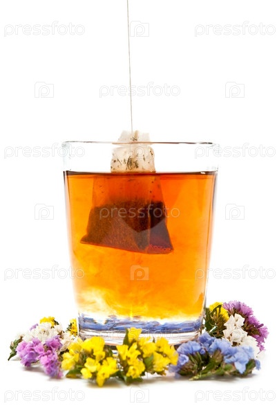 Чай в стеклянном стакане на белом фоне