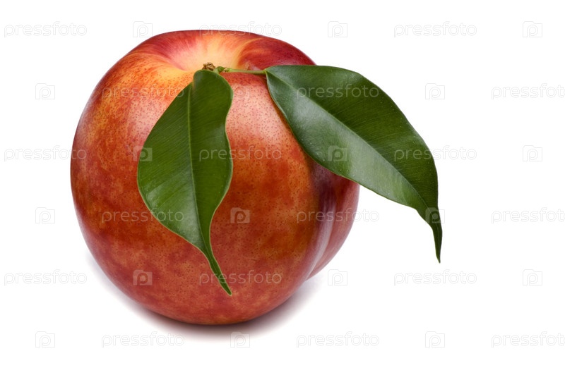 Спелый персик с листочками на белом фоне