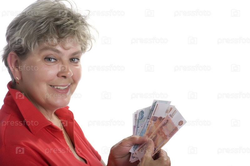 Счастливая женщина с деньгами на белом фоне