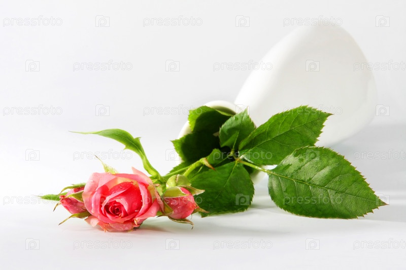 Упавшая ваза с розовой розой крупным планом. Изоляция на белом фоне
