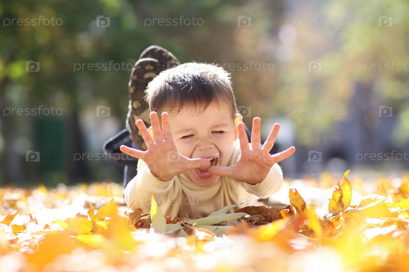 Маленький мальчик, лежащий в осенней листве
