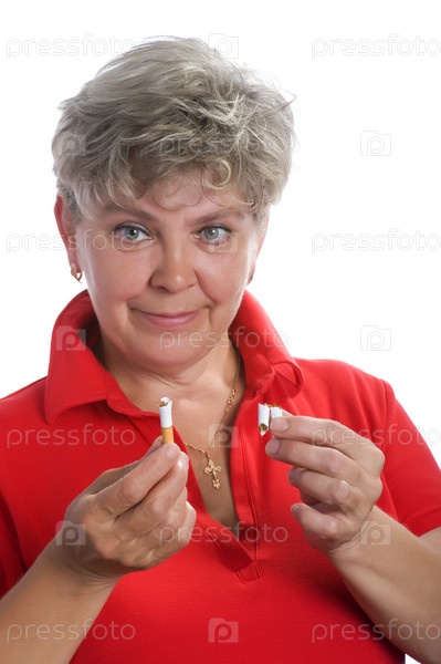 Женщина со сломанной сигаретой на белом фоне