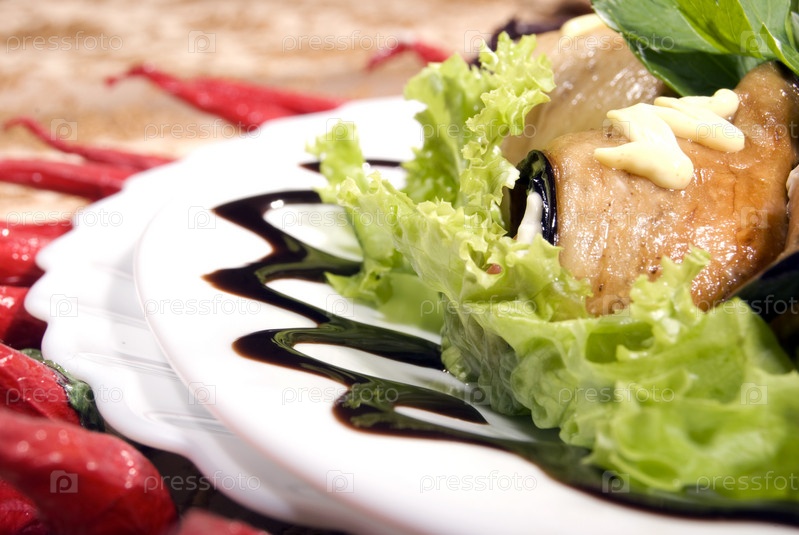 Закуска из листьев салата и баклажанных фаршированных рулетов с майонезом, крупный план